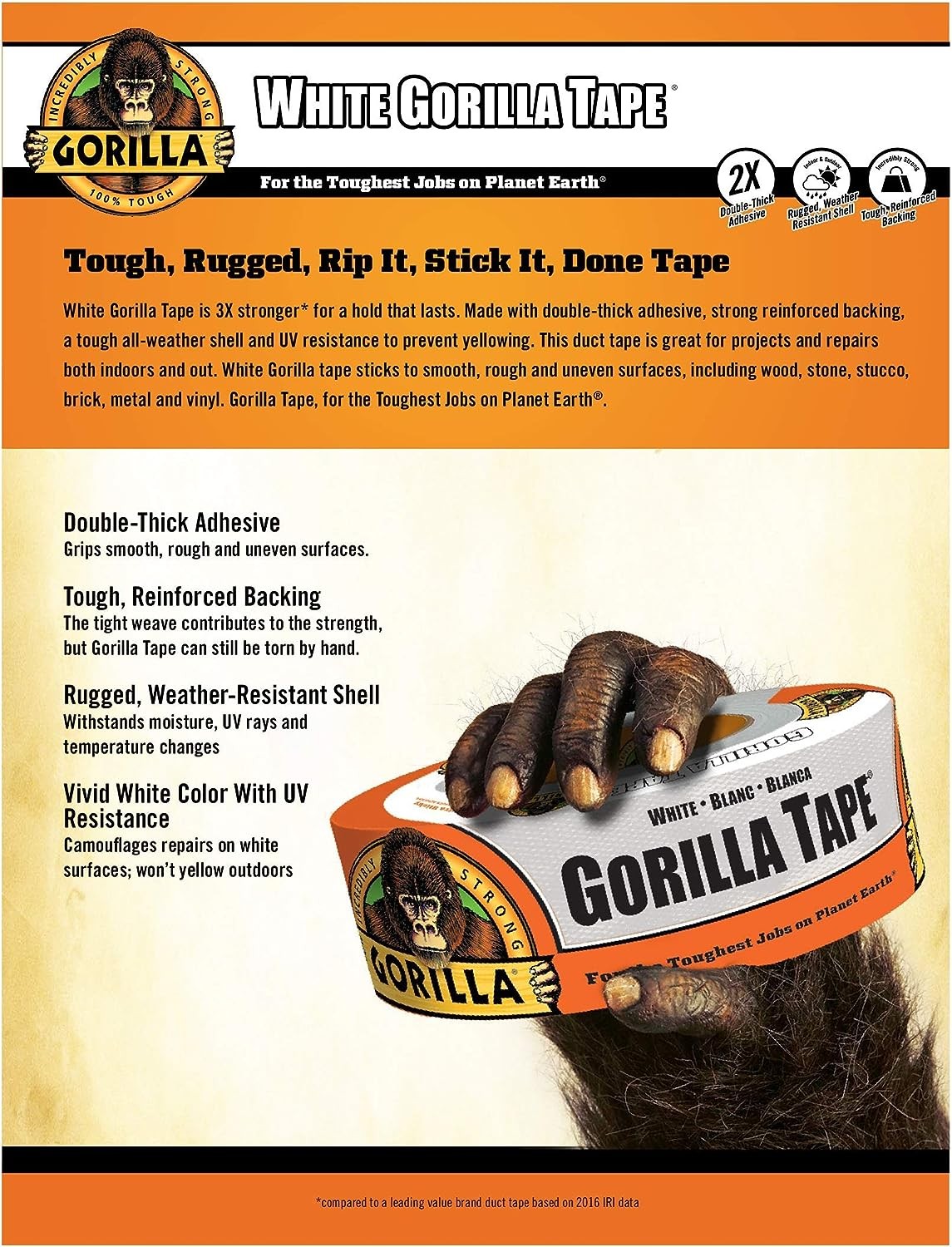 White Gorilla Tape Is 3X Stronger For A Hold That Lasts. Made With Double-Thick Adhesive, Strong Reinforced Backing And Tough All- Weather Shell. This Duct Tape Is Great For Projects And Repairs Both Indoors And Outdoor. Gorilla Tape Sticks To Smooth, Rough And Uneven Surfaces Including Wood, Stone, Stucco, Brick, Metal, And Vinyl. Gorilla Tape, For The Toughest Jobs On The Planet. Compared To Leading Value Brand Duct Tape Base On 2016 IRI Data. Tough, Reinforced Backing: Tight Weave Contributes to Strength, But Can Be Torn By Hand. Rugged, Weather Resistant Shell: Withstands Moisture, UV Rays And Temperature Changes.