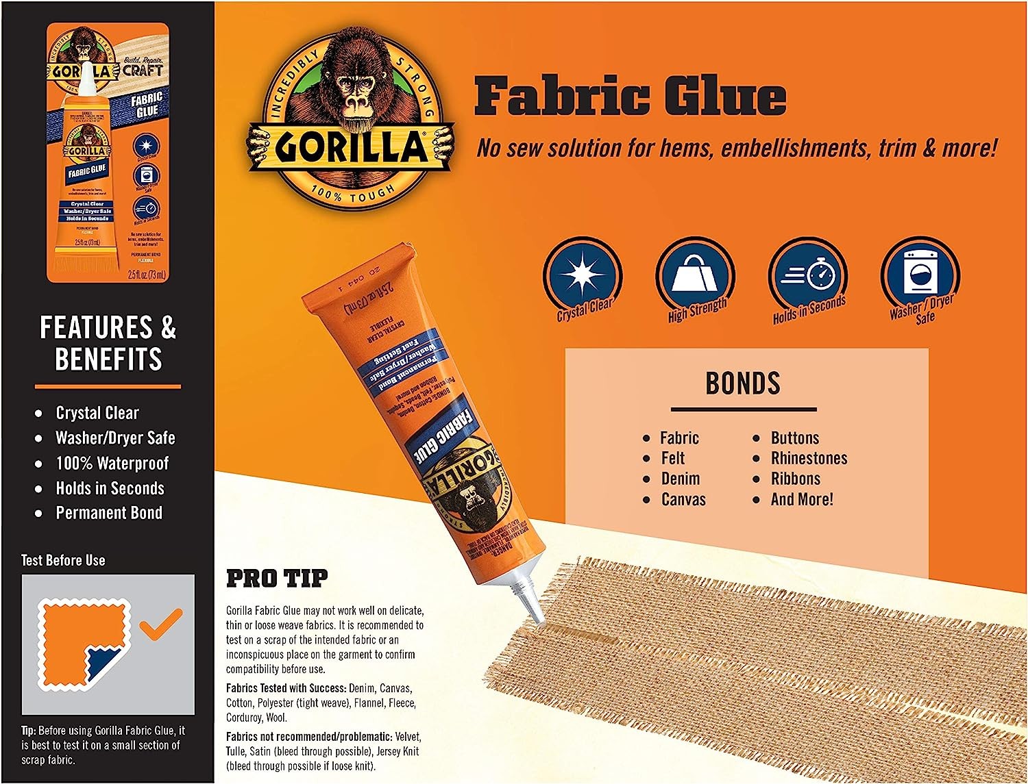 Gorilla Fabric Glue Is 100 % Waterproof, No Sew Solution For Hems, Embellishments, Trim And More. Formulated To Bond Fabric And Hard To Hold Embellishments. Fabric Glue Provides A Fast Setting, Permanent Bound That Remains Flexible After Washing. This High Strength Adhesive Dries Crystal Clear And Can Be Used And A Variety Of Surfaces. Making It A Perfect Alternative To A Traditional Needle And Thread. Permanent Bond, Flexible, Hold In Seconds, Washer And Dryer Safe. Bonds: Cotton, Denim, Polyester, Felt, Beads, Sequins, Ribbon And More.