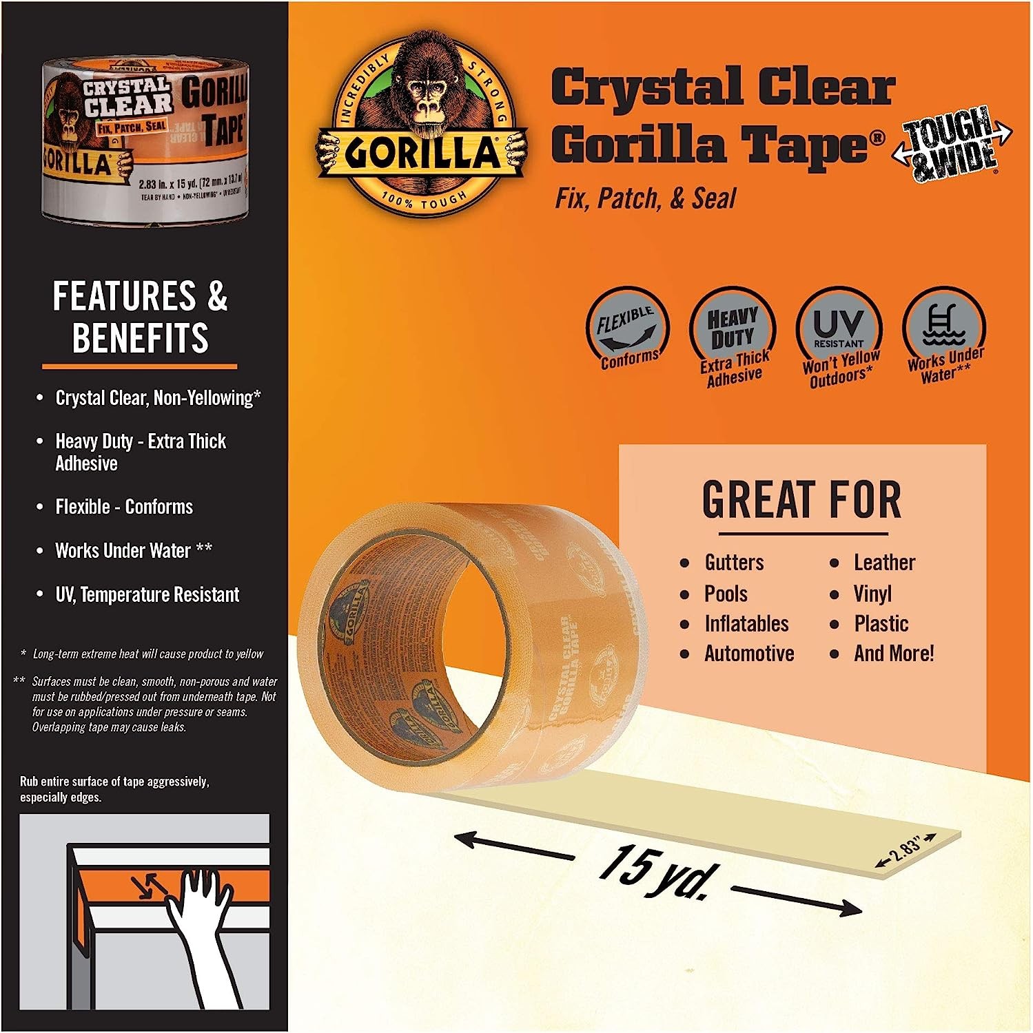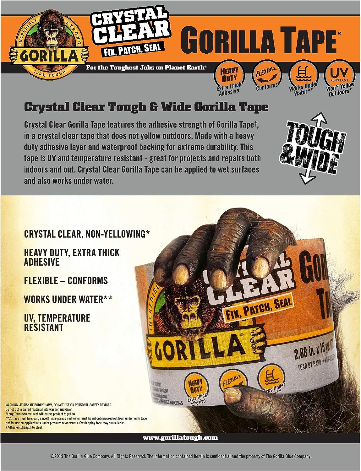 Crystal Clear Transparent Gorilla Dose Not Yellow Outdoors. Made With A Heavy duty Adhesive layer And Waterproof Backing For Extreme Durability. UV And Temperature Resistant. Great For Projects And Repairs Both Indoor And Outdoor. Can Be Applied On Wet Surfaces.