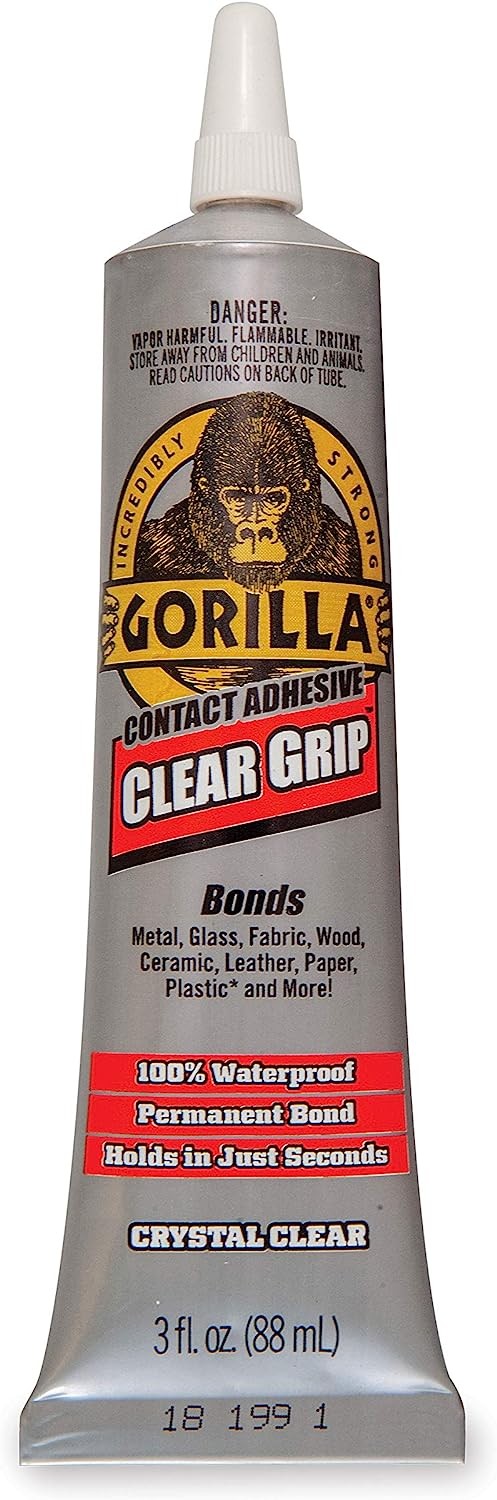 3 oz. Gorilla Clear Grip Adhesive, Flexible, Fast Setting, Strong Permanent Bond, Paintable And Waterproof, Indoor And Outdoor. Non-Run Formula. Bonds Metal, Glass, Fabric, Wood, Ceramic, Leather, Paper, Plastic And More.