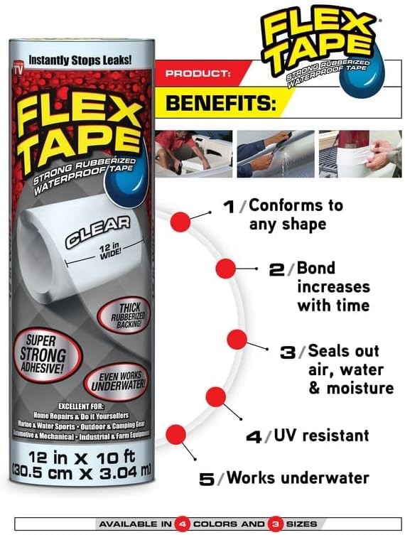 Flex Tape Is A Super Strong Waterproof Tape That Can Instantly Patch, Bond And Seal Virtually Anything. It Can Be Applied On Dry Or Wet Surfaces. And It Even Works Underwater. Flex Tapes Powerful Adhesive Bonds Instantly To Almost Any Surface And Gets Stronger With Time And Pressure. Specially Formulated With A Thick, Flexible, Rubberized Backing That Conforms To Any Shape Or Object. Instantly Seal Out Water, Air And Moisture To Create A Super Strong, Flexible, Watertight Barrier. UV Resistant, Environmentally Friendly. VOC-Free. Withstands Extreme Temperature And Weather Conditions, Perfect For A Variety Of Surfaces. Thick, Flexible, Waterproof, Rubberized Adhesive And Tape. Available In Different Sizes. Can Be Applied In Warm, Cold, Wet, Dry And Even Underwater. Can Withstand Extreme Weather Condition And Temperature -70 F To 200 F(Apply In Temperature Between 20 F And 120 F). Easy To Apply Just Cut, Peel, Stick And Seal. Cannot Be Repositioned Once Bond. Works On : PVC, Acrylic, Metal, Steel, Aluminium, Wood, Ceramic, Porcelain, Tile Glass, Rubber, Fiberglass, Stucco, Plaster, Stone, Cement, Concrete, Drywall, EDPM Roofs, Some Plastic, Fabrics, Vinyl And More. For Maximum Adhesion On Porous Surfaces, Using A Standard Blow Dryer Will Help The Adhesives Bond With The Surface. Continued Firm Pressure Will Help Increase Adhesion. Flex Tape May Resist Bonding To Plasticized Or Waterproof Materials, Siliconized, Greasy, Oily, Dirty, Or Porous Surfaces. Fabrics Such As Canvas, Nylon, Polyester, Synthetics, Cotton And Some Other May Need Up To 24 Hours For Max Hold. Cover Large Cracks, Gasps And Holes.