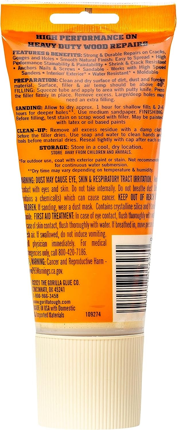 Gorilla All Purpose Wood Filler Is The Go To Product For Strong, Durable Repairs On Cracks, Gouges And Holes. The Unique Formula Is Easy To Spread Allowing For A Smooth, Natural Finish. Its Hight Performance, Stainability, And Ability To Be Painted. Provides A Professional Looking Finished Project.