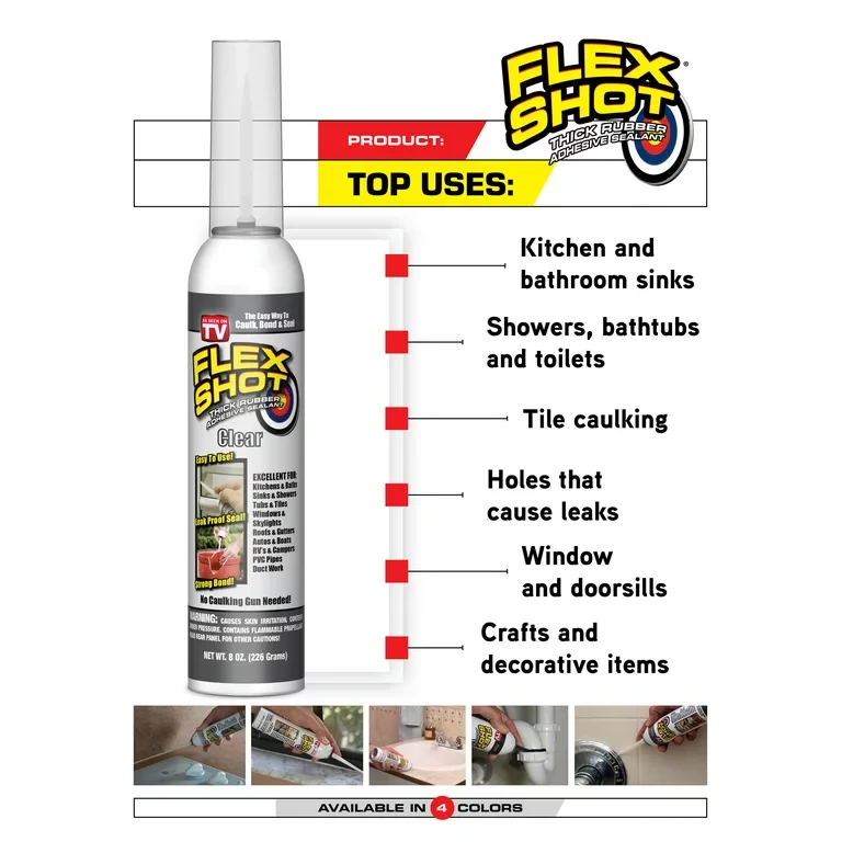 Flex Shot Is A Super Thick Rubber Sealant That Caulks, Bounds, Seal Virtually Everything. Flex Shot Forms A Watertight, Flexible Barrier And Is So Easy TO Use No Need For A Caulking Gun, Just Push The Trigger Nozzle For A Perfect Bead Every Time. Wont Run Or Drip, Never Shrinks Or Crack. Reusable Extension Tube Can Be Cut To Produce Desired Bead Thickness. No Running, No Dripping, No Mess. Adheres To Most Surfaces. Expands And Contracts To Fill In Huge Cracks And Holes That Cause Leaks, Completely Waterproof. Will Not Fade, Dry Crack, Yellow Or Deteriorate Due To Contact With Household Cleaners. Dries To A Supper Thick Stretchy Rubber.