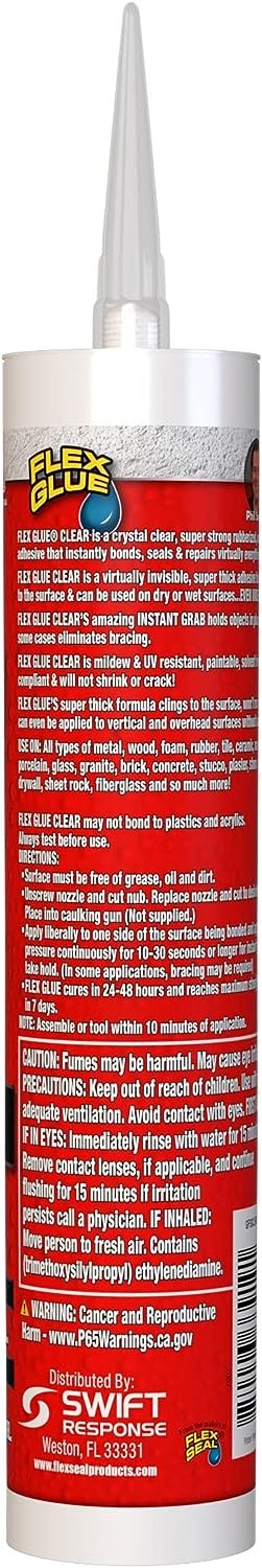 Flex Glue Is A Easy-To- Use, Super Strong, Rubberized, Waterproof Glue That Instantly Bonds, Seals And Repairs Virtually Everything. This Adhesives Instant Grab Technology Holds Objects In Place And In Most Cases, Eliminates The Need For Braces. Cures In 24 - 48 Hours And Reaches Maximum Strength In 7 Days. No Need For Screws Or Nails, Perfect For All Types Of Repairs. Lock Into Place And Hold on Tight. Super Thick, Wont Run Or Drip During Application. Can Be Used On Wet Or Dry Surfaces And Even Underwater. Remains Flexible Will Not Shrink Or Crack. Easily Applied To Vertical And Overhead Surfaces. VOC Compliant, Low Odour Adhesive, Solvent-Free And Paintable. Mould, Mildew, UV And Weathering Resistant. Cures In 24-48 Hours, Reaches Maximum Strength In 7 Days. A Standard Caulking Gun Is Need (Not Included). Works On : Metal, Wood, Foam, Rubber, Tile, Ceramic, Marble, Porcelain, Glass, Granite, Brick, Concrete, Stucco, Plaster, Stone, Masonry, Drywall, Fiberglass, Some Plastics, Vinyls.