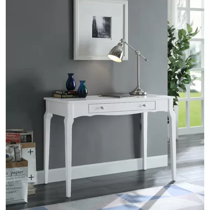 Bring classic style to your home office with this simple desk. We love that this versatile piece also makes a great vanity table for your bedroom, bathroom, or dressing area. It’s made of engineered wood and features a clean-lined silhouette, with tapered legs and a curved apron. Its single drawer offers plenty of room for supplies, while its 42” wide and 19” deep top is just right for your computer and monitor, or makeup and accessories. This table completes the look of any traditional, farmhouse, or cottage setting.