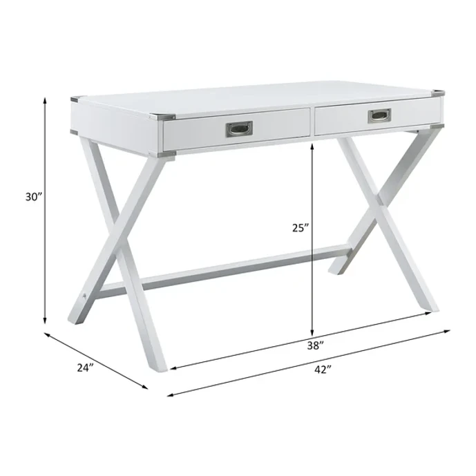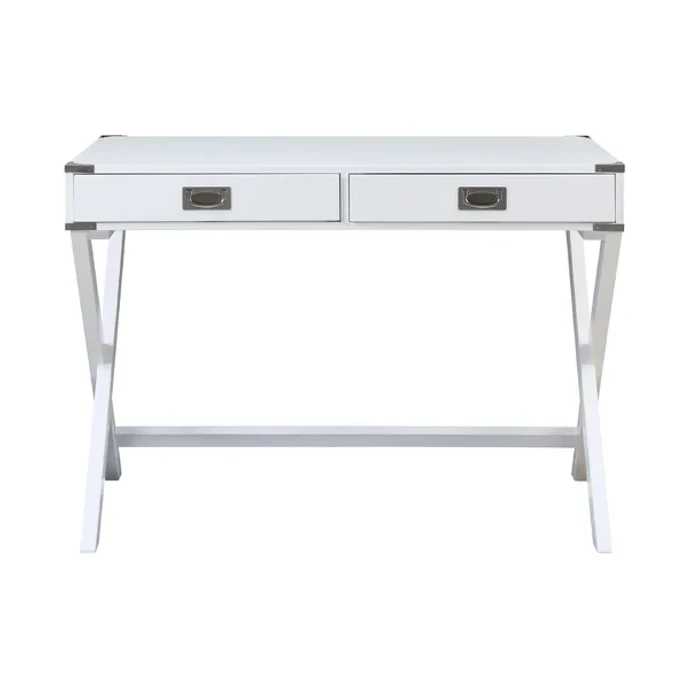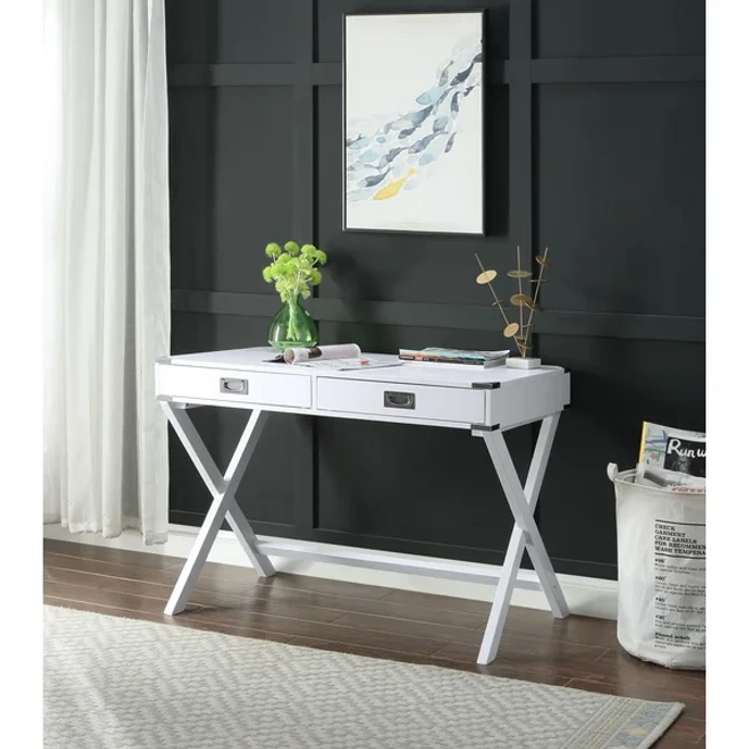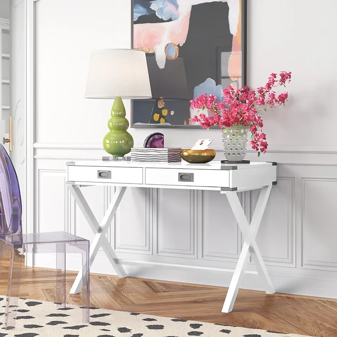 This writing desk features an eye-catching modern design that comes in a sleek, solid hue with a few glam-inspired touches. It's crafted from solid and engineered wood, and it rests on a cross-legged base with a stretcher bar in back for extra support. Its rectangular 42" long desktop gives you plenty of space for a laptop along with notebooks and other necessary office accessories. Two drawers with metal pulls and corner accents provide a place for pens, paperclips, and other supplies.