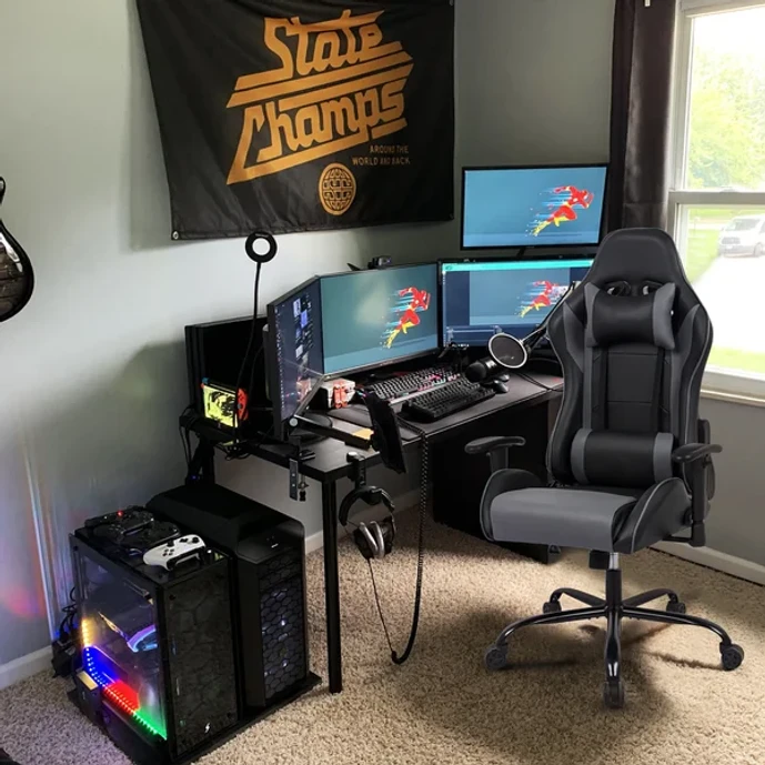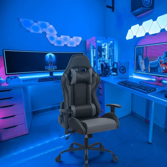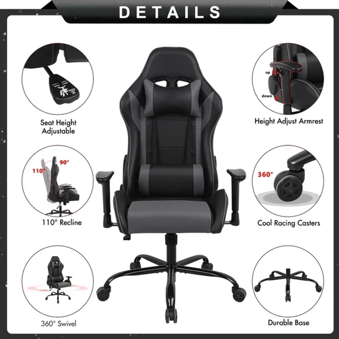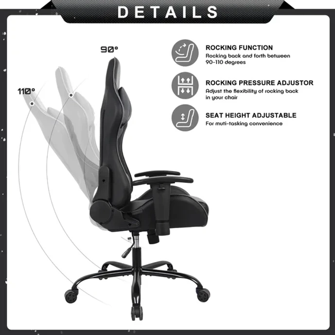 This gaming chair features a sleek, ergonomic design that gives an ultra-modern look to your home office or game room. It's wrapped in faux leather, with multiple cushioned backrests to provide ample lumbar support and padding for your neck — so you're able to enjoy this seat for hours. Adjustable height, armrest, and headrest makes this chair a great option for different ages and sizes. It also rocks, tilts, and swivels 360° to suit your needs. Plus, the black metal base rests on five wheels for easy movement across most floor types. Full assembly required, with all tools included.