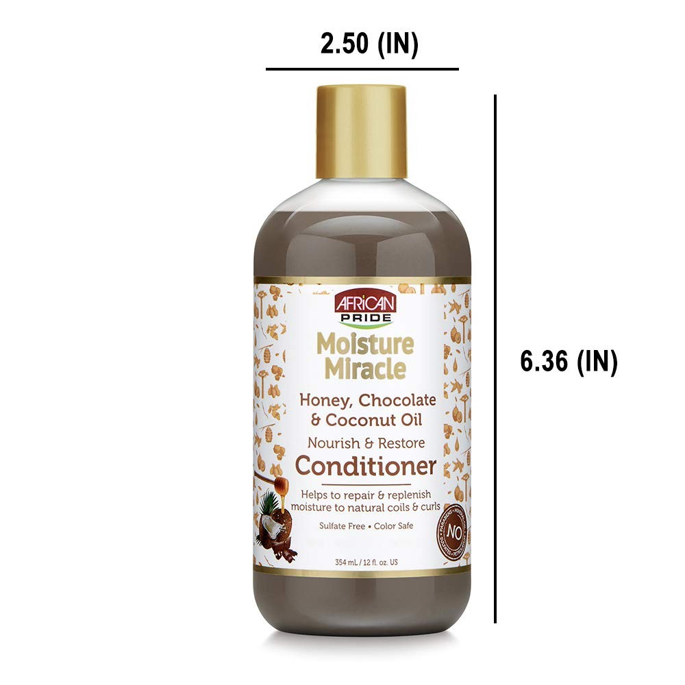 The moisturizing blend of African Pride Moisture Miracle Honey, Chocolate & Coconut Oil Conditioner uses the natural benefits of honey & coconut oil plus the restorative benefits of chocolate to hydrate & restore dry curls.