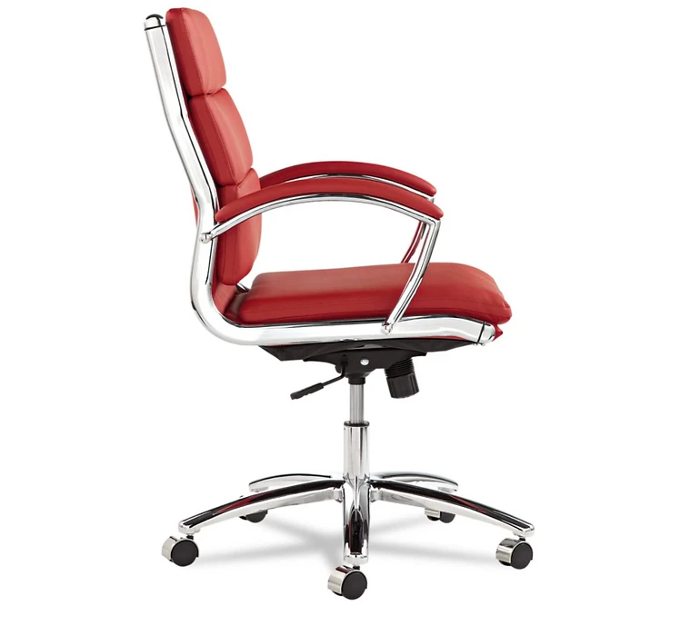 Contemporary cushioned seating with a slim profile. waterfall seat reduces pressure on the back of the knees for improved circulation. padded arm caps for comfort and support. five-star base with casters for easy mobility.