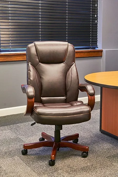 • Classic wood and leather styling in warm walnut finish and marbled chocolate leather