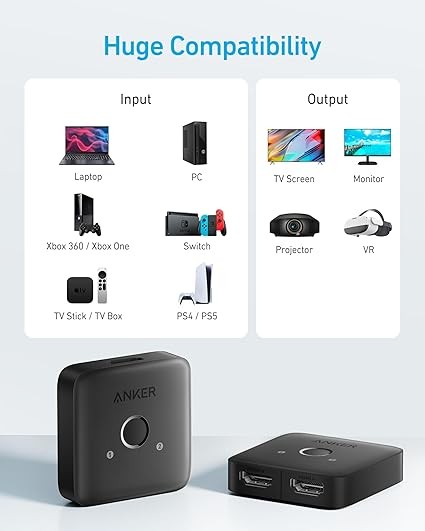 Anker HDMI Switch, 4K@60Hz Bi-Directional HDMI Splitter, 2 in 1 Out with Smooth Finish, Supports HDR, 3D, Dolby, Compatible with Laptops, PC, Xbox Series, PS5 / PS4, Projector, and More