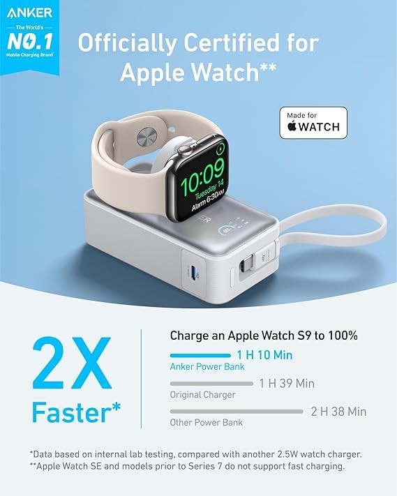 • Officially Certified for Apple Watch: Maximize your charging efficiency with the Apple-certified power bank, capable of charging an Apple Watch Series 9 to 47% in just 30 minutes.
