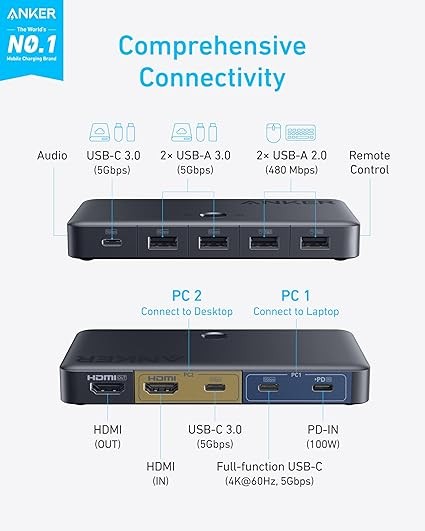 Anker USB 3.0 HDMI KVM Switch, 5 USB 3.0 Ports, Supports 4K@60Hz, Magnetic Remote Button for One-Click Switch Between Laptop and Desktop, Works with Dell, MacBook, iPad, and More (Cables Included)