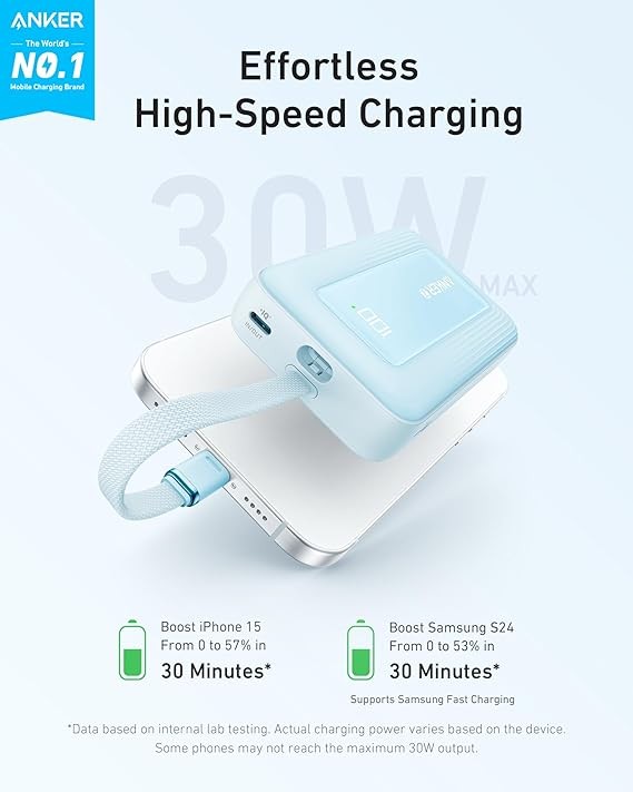Anker Zolo Power Bank, 10,000mAh 30W Portable Charger with Built-in USB-C Cable for Travel, Fast Charging Battery Pack for iPhone 16/15 Series, MacBook, Galaxy, iPad, and More