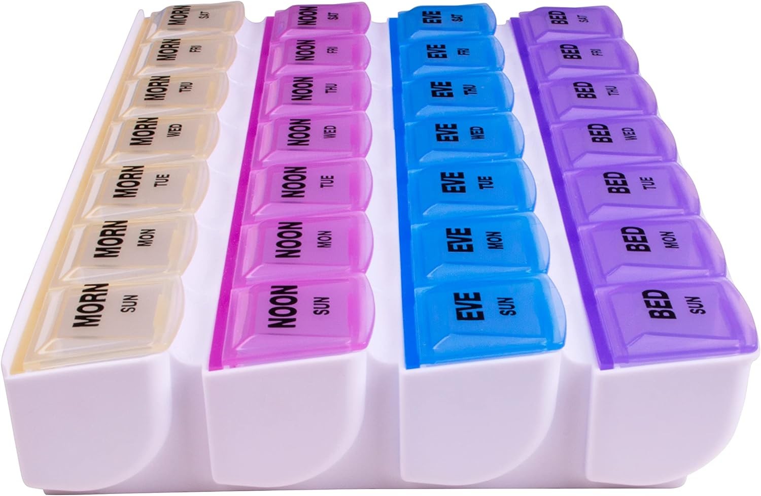 The 7-Day MediPlanner offers a convenient and aesthetically pleasing method for organizing medications and vitamins. The vitamin sorter's color coded compartments make it easy to keep track of and organize your pills. Each pill compartment is see-through for a convenient view of the tablets inside. The travel pill case features 28 total spaces for medication, each labeled by the time of day and the day of week. This daily pill organizer will help ensure you never miss taking your tablets again. Each pill separator features a contoured design to grasp pills easily without struggle. It's ideal for anyone with arthritis, a week grip, or any other hand condition. This daily pill case is the ideal solution for anyone with an extensive medication regimen.