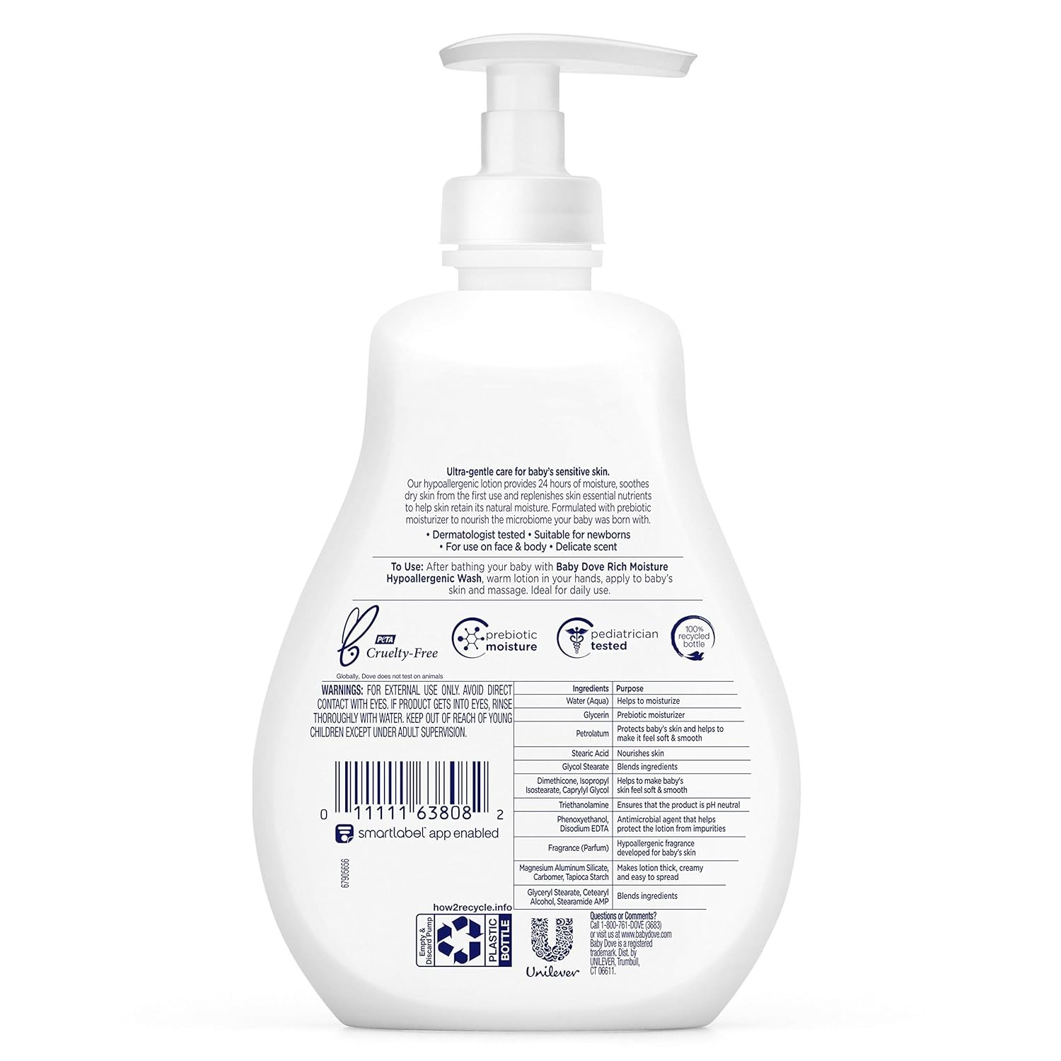 Bathing can lead to skin dryness. Baby Dove Rich Moisture Face and Body Lotion are made with 100% skin-natural nutrients, which are nutrients identical to those naturally found in skin, and prebiotic moisture to help replenish the essential moisture and nutrients baby's sensitive skin can lose during bath time.