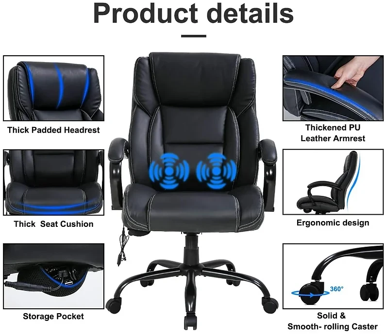 Big & Tall 500lbs PU Leather Ergonomic Executive Chair with Massage Lumbar Sup