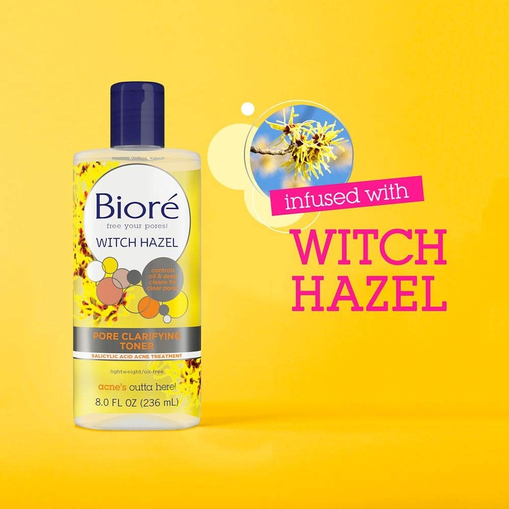 Skin acting wicked? Cast a spell on pore-clogging dirt and oil with Biore Witch Hazel Pore Clarifying Toner. This light weight and oil free formula is ideal for oily, blemish-prone complexions. Biore Pore Clarifying Toner works with witch hazel, known to tone skin and tighten pores, to dissolve residue a cleanser might miss, while salicylic acid works to control oil and fight acne for clear pores. Satisfaction Guaranteed. Limitations may apply.