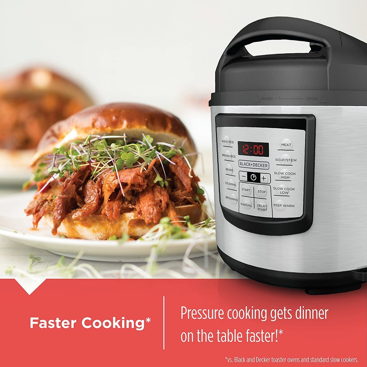 Turn up the pressure for faster cook times*! The BLACK+DECKER? 11-in-1 Cooking Pot gets your favorite meals to the table quickly by sealing in heat, steam, and flavor throughout the cooking process. Choose from 7 dedicated pressure functions and 4 slow cooker functions to make all your favorites with one-pot convenience: meats and roasts, soups, stews, rice, and plenty more. You can even sear meat with the browning function before pressure cooking it to perfection and adding in other ingredients. Other non-pressure functions include four slow cooking settings and keeping food warm. Safety is a priority with this pressure cooker, and it?s designed with 9 safety checks to ensure the unit works correctly and safely every time. Plus, the digital controls and delay timer make it easy to select the exact function and time you desire. You like fast cooking, right? How does fast cleanup sound?! The nonstick cooking pot is dishwasher-safe and so are the included accessories: trivet, rice-measuring cup, and nonstick-friendly serving spoon. Also included is a recipe book packed with delicious meals designed especially for one pot pressure cooking. Get ready to save time in the kitchen! The BLACK + DECKER? 11-in-1 6-Quart Cooking Pot is the perfect way to make delicious food fast! *vs BLACK + DECKER toaster ovens and standard slow cookers **always make sure to follow food safety recommendations and visit www.foodsafety.gov for more information