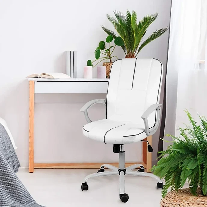 Our white leather office chair with ergonomic lumbar support and arms can provide you with good sitting experience.The ergonomic armrest of this mid-back computer chair will let your body relaxed for long time use.Size and look makes the desk chair save space.Ideal for any place such as home office,dorm room or professional work spaces.And this adjustable seat height computer chair is easier to raise or lower the seat. The rocking mode can relax you from heavy work or gaming, pull out the handle to start rocking and pull it in to stop. This task chair can support up to 250 lbs of weight.Also the swivel PU casters provides great mobility,suitable for hard floors, carpet and more, without noise during swiveling and the won't scratch the floors surface.We back them all with an 18-month sales service. Free replacements for non-human damaged parts within 18 months after purchase, and provide friendly, easy-to-reach support.Please contact us if the chair has any problems. Go to your order find Contact Seller, we will reply to you within 24 hours.
