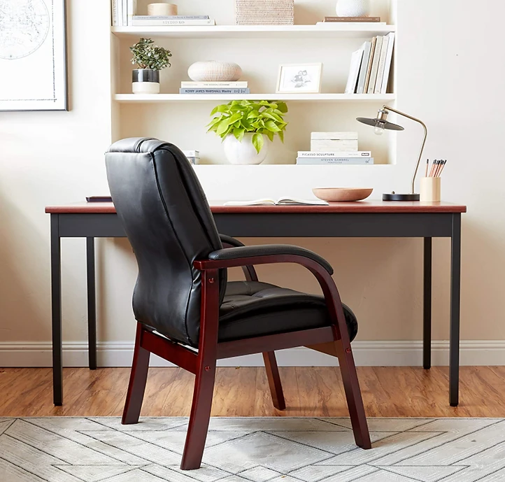• Boss Office Products Mid Back Wood Finished Guest Chair brings comfort and classic design to your work or home space. This chair provides superior support and is available in a rich mahogany wood finish that complements a timeless traditional decor.