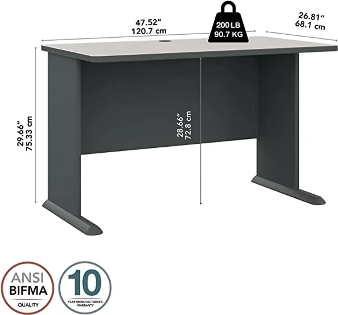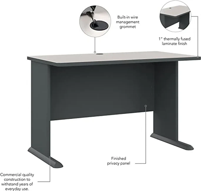 The Bush Business Furniture Series A 48W Desk provides lasting comfort and durability in a compact package. Perfect for a small office or as part of a larger workspace, the commercial-grade Desk features an open C-Leg design to maximize legroom. Thick end panels resist damage, while a thermally fused laminate surface fends off scratches and stains for a long-lasting professional appearance. A comprehensive wire management system organizes and secures computer cables to keep them out of your way. Sturdy Desk feet include encapsulated steel armature and adjustable levelers for use on all types of flooring. The Office Desk accepts a coordinating Hutch, Mobile File Cabinets, Keyboard Tray or Pencil Drawer (all sold separately). Series A completes your multi-person workspace, classroom, home office or anywhere in between with a variety of configuration options. Featuring 7 attractive two-tone finishes and contemporary styling, this commercial office furniture adapts to your surroundings.