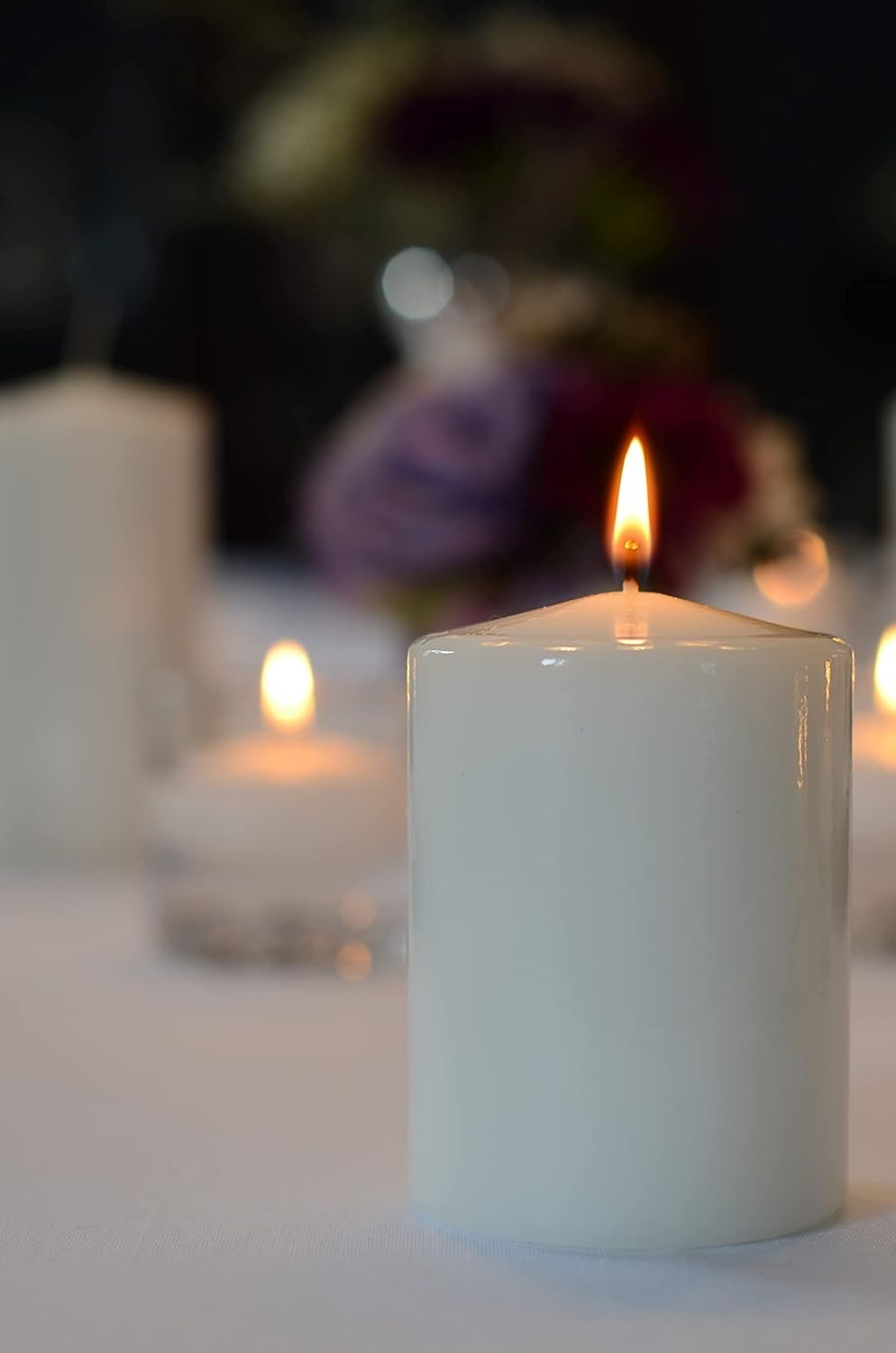 Our unscented 4"H White pillar candles are ideal when creating a beautiful candlelight arrangement for the home or wedding decor. When color is essential for weddings, our candles are available in 45 trendy candle colors hand over dipped to match and compliment your wedding centerpiece decorations, bridesmaid dresses, napkins and wedding favors. Our candles are crafted with a pure white fully refined unscented paraffin wax core and then dipped by hand in our specially formulated colored over-dip wax to ensure the cleanest burn and maximum performance. We use 100% cotton wicks in all of our candles. Burns approximately 40 hours. Our candles are designed to burn smokeless and drip less at room temperature and still air. Made in Canada.