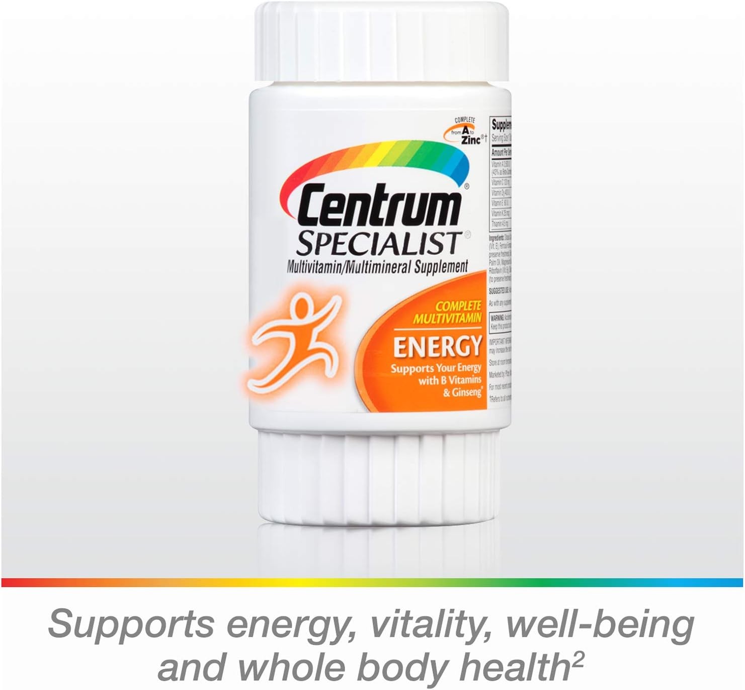 Centrum Specialist Energy Adult (60 Count) Multivitamin / Multimineral Supplement Tablet,Vitamin D3, C, B-Vitamins and Ginseng. Centrum Specialist Energy Multivitamin is a daily supplement for adults that is specifically formulated to naturally help the body produce energy, while providing all the benefits of Centrum. With 100% or more of the daily value of 16 essential nutrients, Centrum is the most complete multivitamin for men and women. Centrum Specialist Energy is further enhanced with Ginseng and higher levels of B Vitamins (1) to help maintain vitality and well-being and to help support your energy needs without the use of stimulants like caffeine. A daily multivitamin is part of an overall healthy lifestyle and can help adults get the recommended amount of key vitamins and minerals. Help support your body head-to-toe with Centrum, the #1 doctor and pharmacist recommended brand (3).* (1) Compared to Centrum Adult Multivitamins (2) Energy: B-Vitamins and Iron support daily energy needs; Immunity: Vitamins C, E, Beta-Carotene and Zinc help support normal immune function; Metabolism: B-Vitamins aid in the metabolism of fats, carbohydrates and proteins.* (3) Based on IMS Health data (adult multivitamin brands in the US as of March 2017), and 2017 Pharmacy Times Survey of Pharmacists' OTC Recommendations. * These statements have not been evaluated by the Food and Drug Administration. These products are not intended to diagnose, treat, cure or prevent any disease.
