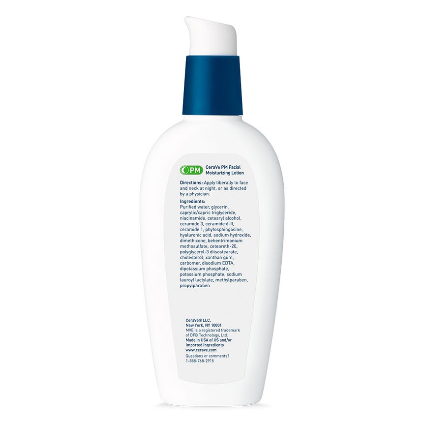 Developed with dermatologists, CeraVe PM Facial Moisturizing Lotion has an ultra-lightweight, unique formula that moisturizes throughout the night and helps restore the protective skin barrier with three essential ceramides (1,3,6-II). This night cream is formulated to lock in your skin's moisture and helps restore you skin's natural barrier while you sleep. The formula also contains hyaluronic acid to help retain skin’s natural moisture and niacinamide to help calm skin.