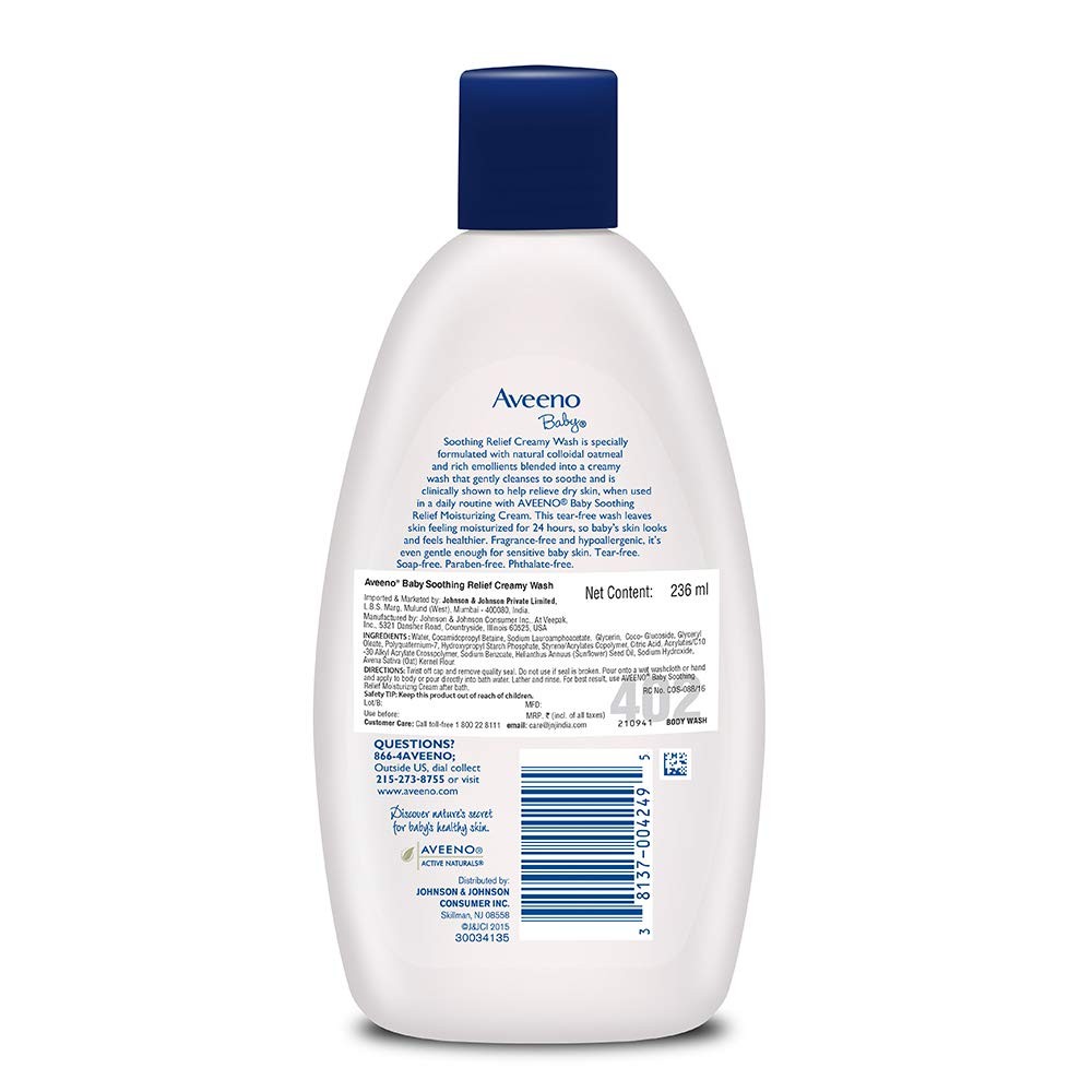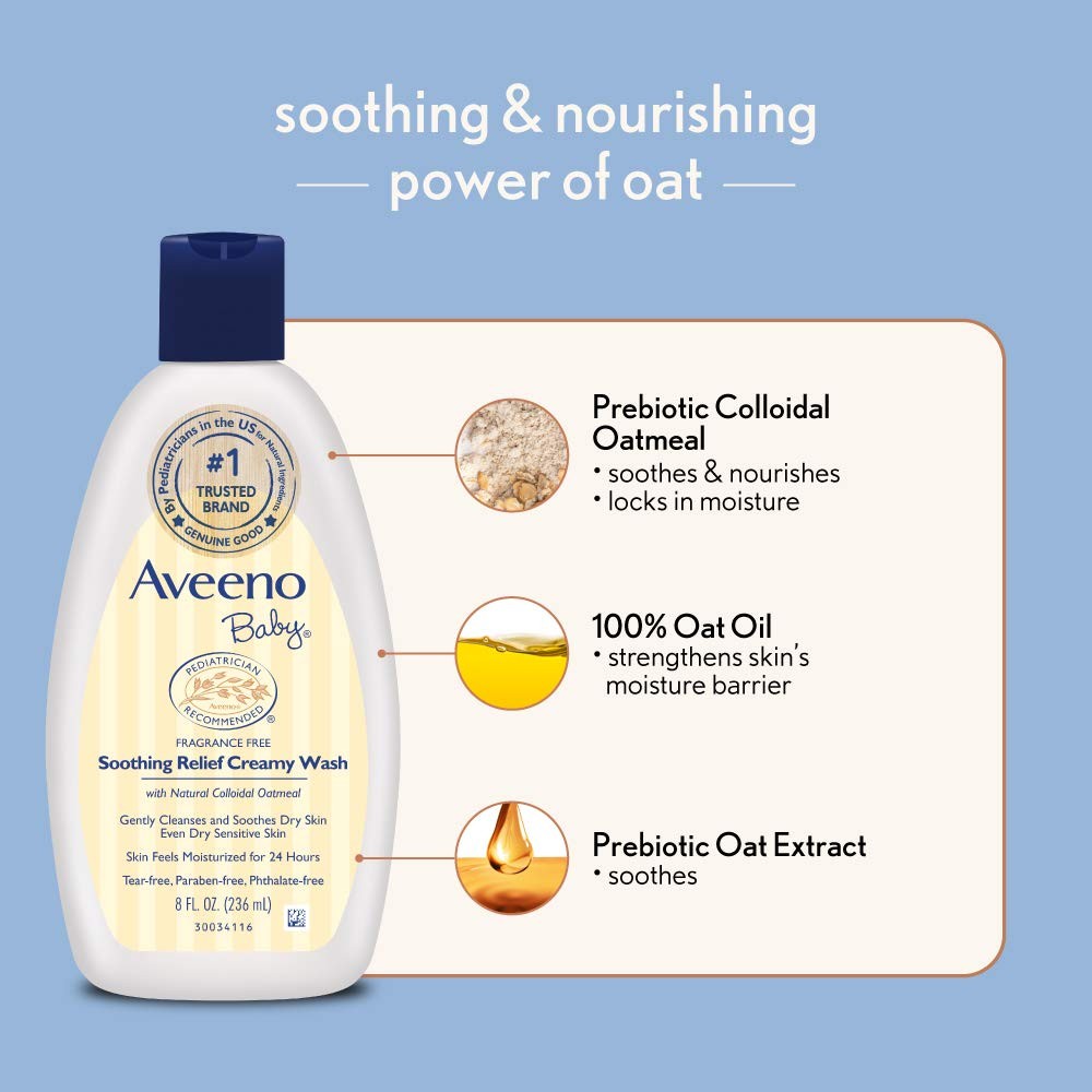 AVEENO® Baby Soothing Relief Creamy Wash is specially formulated with natural colloidal oatmeal and rich emollients that gently cleanse and soothe the skin. The hydrating, tear-free rich creamy lather leaves skin feeling moisturized for 24 hours, so your baby's skin looks and feels healthier. Fragrance-free and hypoallergenic for dry, sensitive baby skin.