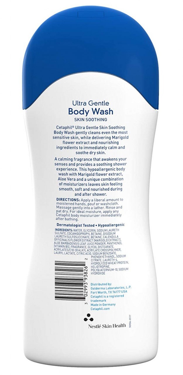 Cetaphil Ultra Gentle Body Wash gently cleanses even the most sensitive skin without stripping it of its natural moisture, while delivering nourishing ingredients to help maintain the skin's moisture barrier. Contains Aloe Vera, Vitamin B5 and a unique combination of moisturizers that leave skin feeling clean, soft and replenished during and after shower.