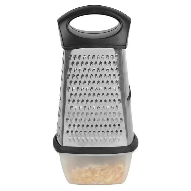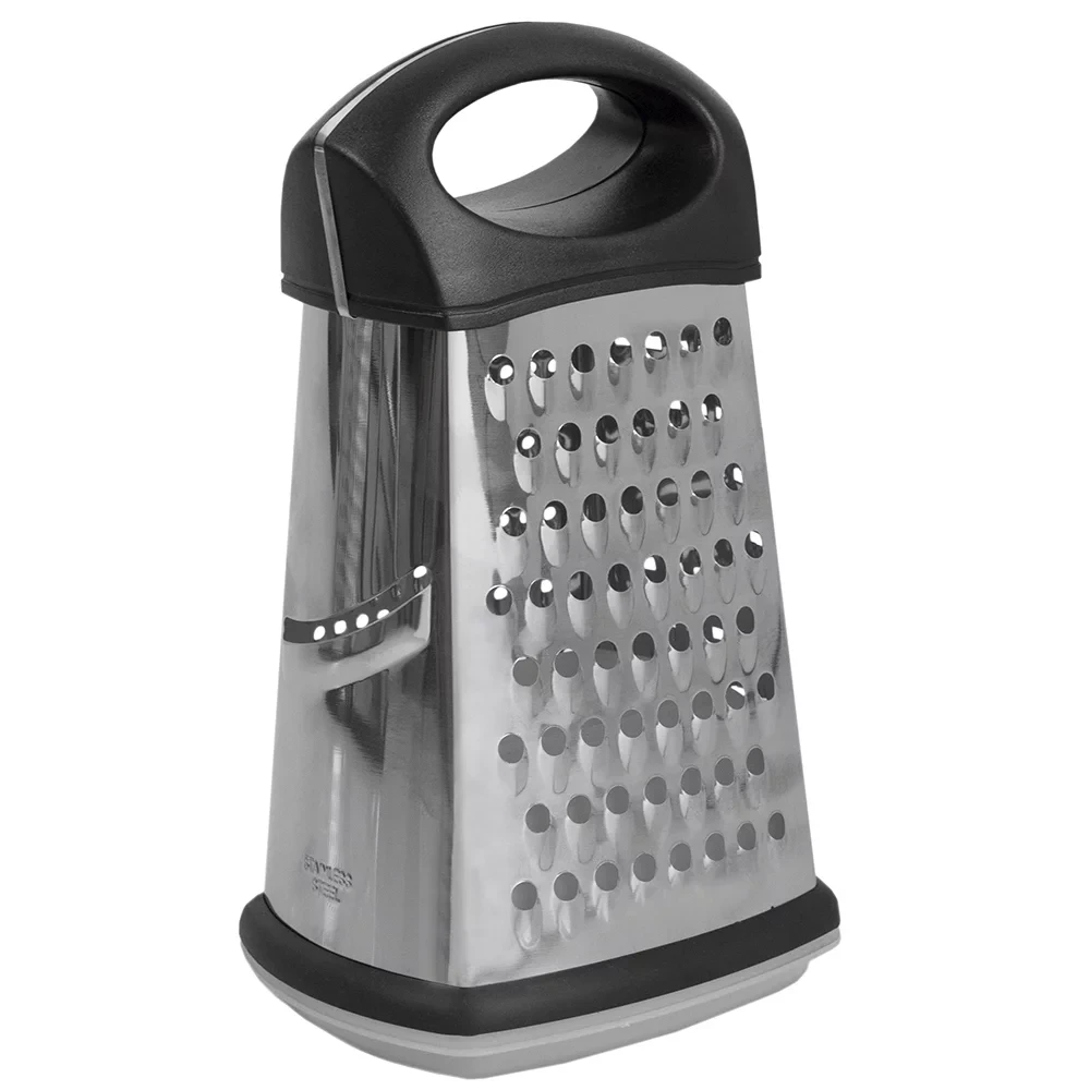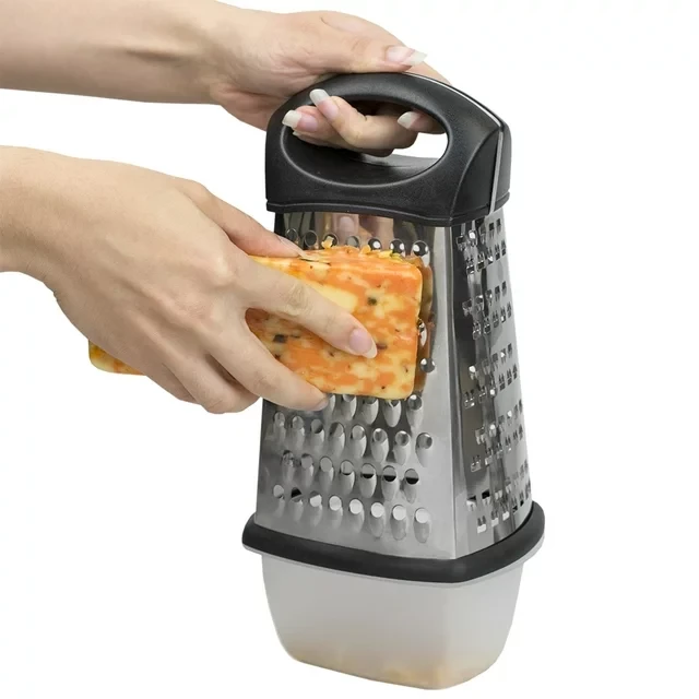• 4 BLADES FOR A VARIETY OF TEXTURES WITH LARGE HANDLE FOR COMFORTABLE USE: Stainless Steel box grater features 4 razor sharp stainless steel blades and a non-slip comfort handle to prevent fatigue while grating