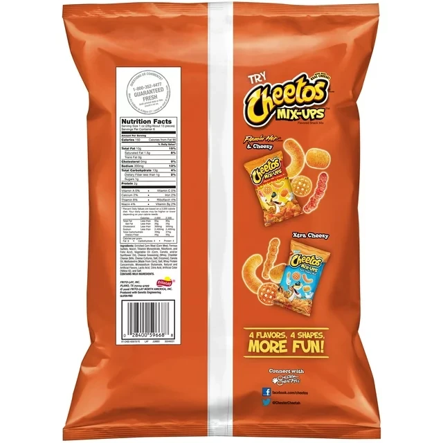 Get the party started with these Cheetos Puffs Cheese Flavored Snacks (8 oz Bag). Enjoy these chips with a meal or alone. Made with real cheese, these Cheetos cheese snack chips are packed with delicious flavor. They are free of gluten and come in a handy 8 oz bag. Enjoy these gluten-free cheese snacks at home, the office or wherever you need a tasty pick-me-up. Wherever the Cheetos brand and CHESTER CHEETAH go, cheesy smiles are sure to follow.
