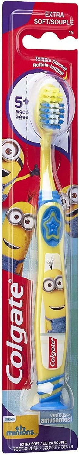 Colgate Kids Minions manual toothbrush is a fun way to encourage good oral care habits early on! It is specifically designed for children 5 years of age and older who have a combination of baby teeth and adult teeth. The toothbrush has our unique soft tongue cleaner on the back of the toothbrush head to clean beyond teeth, thumb grip and rounded handle for a comfortable grip, and suction cup for easy and fun upright storage.