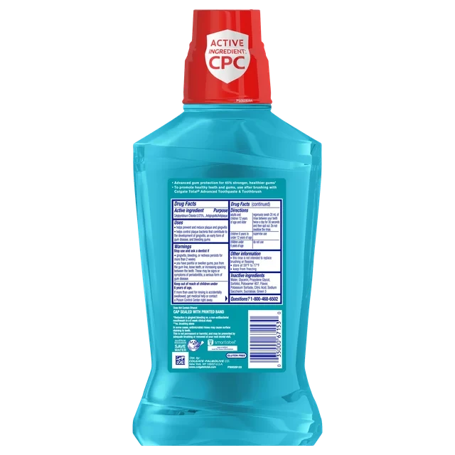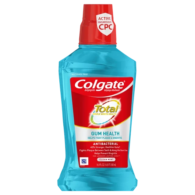 Colgate Total Gum Health mouthwash is a germ-fighting formula that forms a protective shield along the gum line and protects against bacteria. With twice-daily use, it's clinically proven to deliver 45% stronger (reduction in gingival bleeding vs. a non-antibacterial mouthwash in a 6 week clinical study) healthier gums. Colgate Total Gum Health Mouthwash kills 99% of germs on contact, leaving you with a cleaner mouth. This great-tasting formula is an alcohol-free mouthwash (does not contain ethanol) and has a refreshing clean mint flavor. This antibacterial mouthwash offers germ protection for fresh breath.