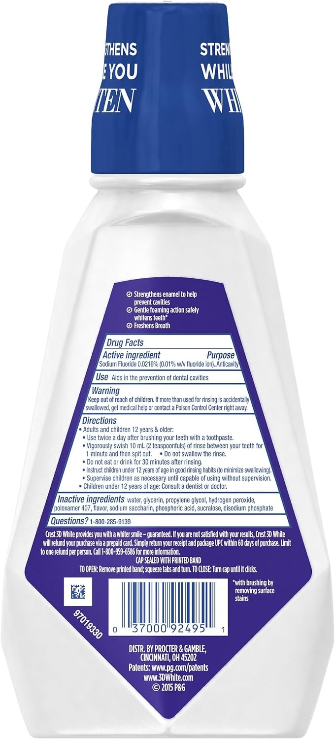 Crest’s exclusive Whitelock Technology acts as a whitening protector that helps prevent new stains from forming. With 3D White Glamorous White whitening mouthwash you’ll see a whiter smile* in 7 days Combined with the refreshing taste of Fresh Mint, 3D White Glamorous White mouthwash is the perfect way to stylize your smile. *with brushing by removing surface stains