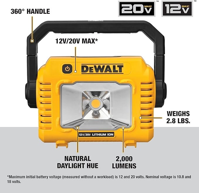 • DEWALT work light has powerful brightness at 2,000 lumen output