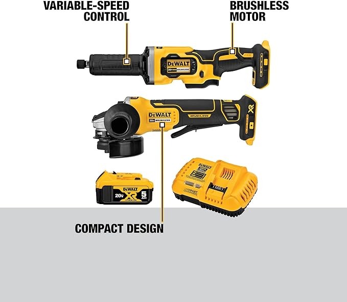 • Included components: (1) DCG413 20V MAX XR 4.5 in. Paddle Switch Small Angle Grinder With Kickback Brake; (1) DCG426 20V MAX XR 1-1/2 in. Variable Speed Cordless Die Grinder; (1) DCB205 20V MAX XR 5Ah Battery; (1) DCB118 8 Amp Fast Charger