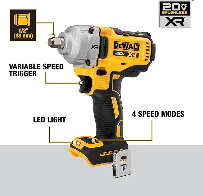 DEWALT 20V MAX Cordless Impact Wrench, 1/2" Hog Ring, Includes LED Work Light and Belt Clip, Bare Tool Only (DCF891B)
