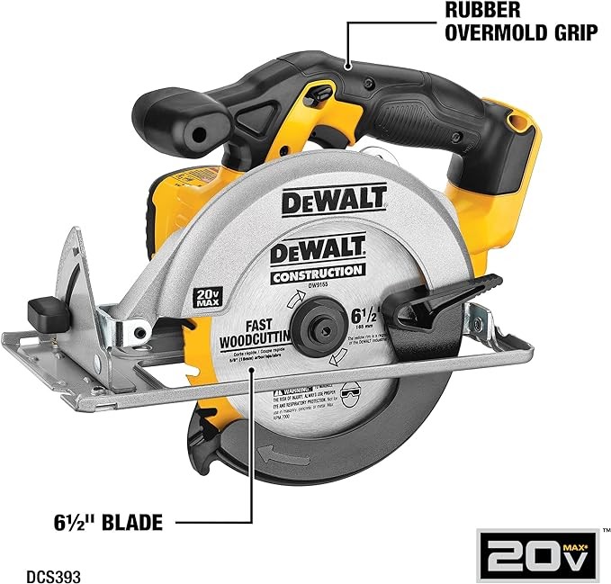 • DCS393 Cordless Circular Saw with 6-1/2-inch carbide blade can cut 2x4s at a 45-degree angle in a single pass