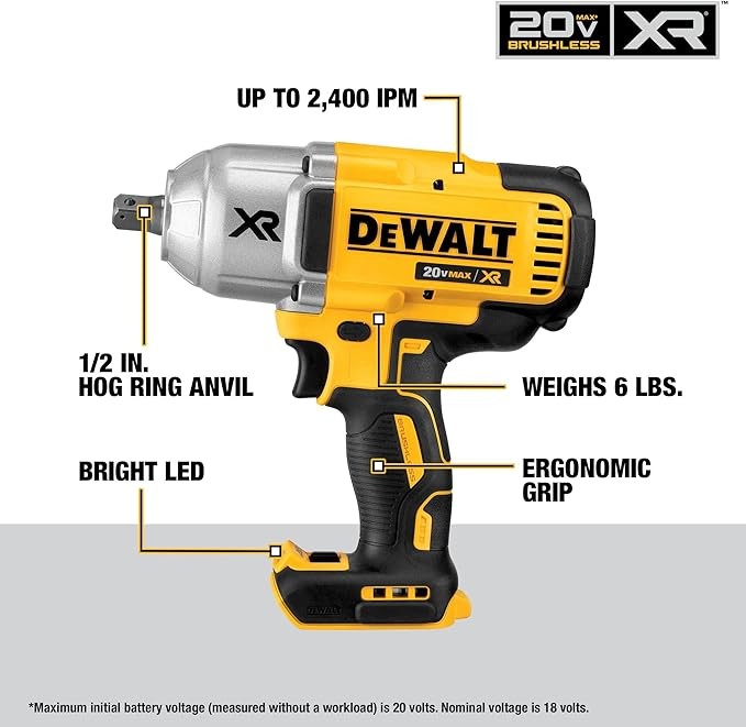 DEWALT 20V MAX XR Brushless High Torque 1/2" Impact Wrench with Detent Anvil, Cordless, Tool Only (DCF899B)