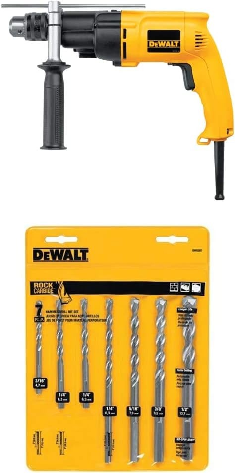 DEWALT DW505 1/2-Inch 7.2-Amp Variable-Speed Reversing Dual Range Hammerdrill with DEWALT DW5207 7-Piece Premium Percussion Masonry Drill Bit Set