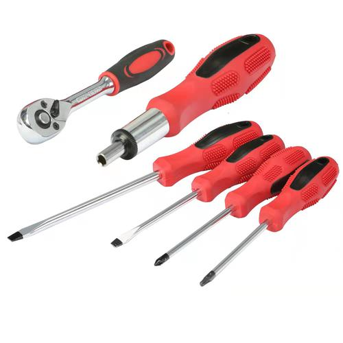 This 106 pieces home use tool set includes: combination wrenches, adjustable wrench, claw hammer, combination screwdrivers, different pliers, and more | Heavy duty blow case: 16.93" x 13.58" x 3.78" (43 cm x 34.4 cm x 9.6 cm) | Weight: 12.1 lb | Made in China.