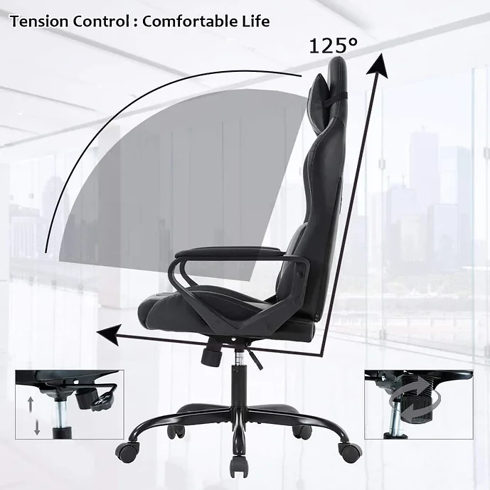 • Multiple Function of Racing Chair: Reclining mechanism feature that allows users to lock backrest in any reclining position between 90° and 155°. Removable headrest and lumbar cushion keeping you comfort after long hours of working and gaming. Adjustable height to fit different height of customers, 360-degree swivel casters that can move smoothly and quietly on floor.