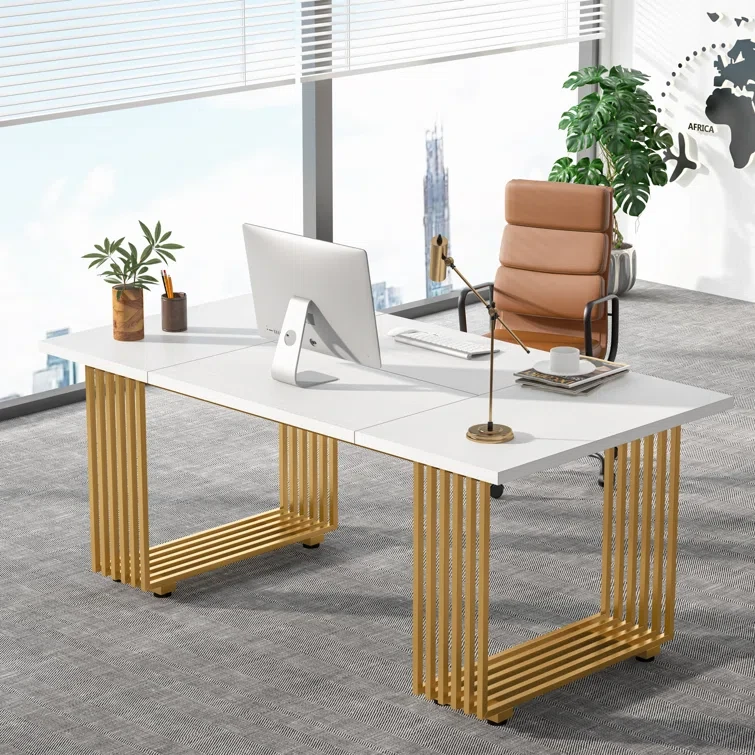 Crafted in a white finish the modern desk features a simplistic design that captures the eye. Equipped with a gold unique design legs, this desk is perfect for extra storage & organization. With 70 inches in width, the simple desk has a spacious surface that offers ample space and workspace and works well as an executive table, writing desk, office table, computer desk, office workstation, study table, conference table, etc.