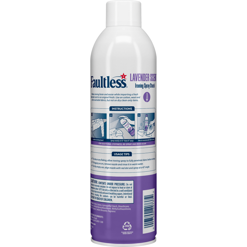 Faultless' unique formula sprays on evenly to provide the body you normally get only from professional laundering. Shirts and blouses come out sharp and crisp. Contains a silicone ironing aid that make the iron glide easier. Imparts a fresh lavender scent.