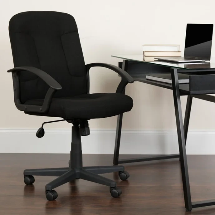 Provide yourself with a comfortable and economical chair by choosing this Flash Furniture GO-ST-6-BK-GG mid-back black fabric office chair with nylon arms! With a mid-back design that supports the mid- to upper-back area, this office chair keeps you safe and comfortable while you work to maximize satisfaction and productivity. In addition, this chair offers curved nylon arms and a thick padded seat with vinyl upholstery and CA117 fire retardant foam for greater comfort.