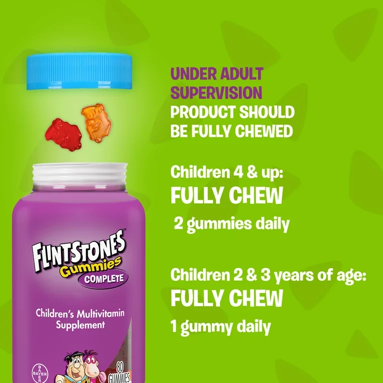 Trusted by parents and pediatricians alike, Flintstones multivitamins have been providing kids nutritional support as they grow up healthy and strong for more than 50 years. Flintstones Complete Multivitamin Gummies offer a wide range of nutrients in easy-to-chew, fruit-flavored gummies that kids love. These daily multivitamins provide vitamins and minerals that growing bodies may need. Flintstones Gummies have key nutrients that support physical energy by helping convert food to fuel, while also supporting bone health, immune health, and eye health in a fun gummy. Flintstones Complete Gummies come in classic Flintstones characters and in tasty flavors like cherry, orange, and raspberry. This statement has not been evaluated by the Food and Drug Administration. This product is not intended to diagnose, treat, cure, or prevent any disease. The Supplement Facts labeling information contained within this website should be regarded as the most up to date and may differ from product labeling that you have purchased. Please consult your product package for information, including allergens, specific to the product you have purchased.