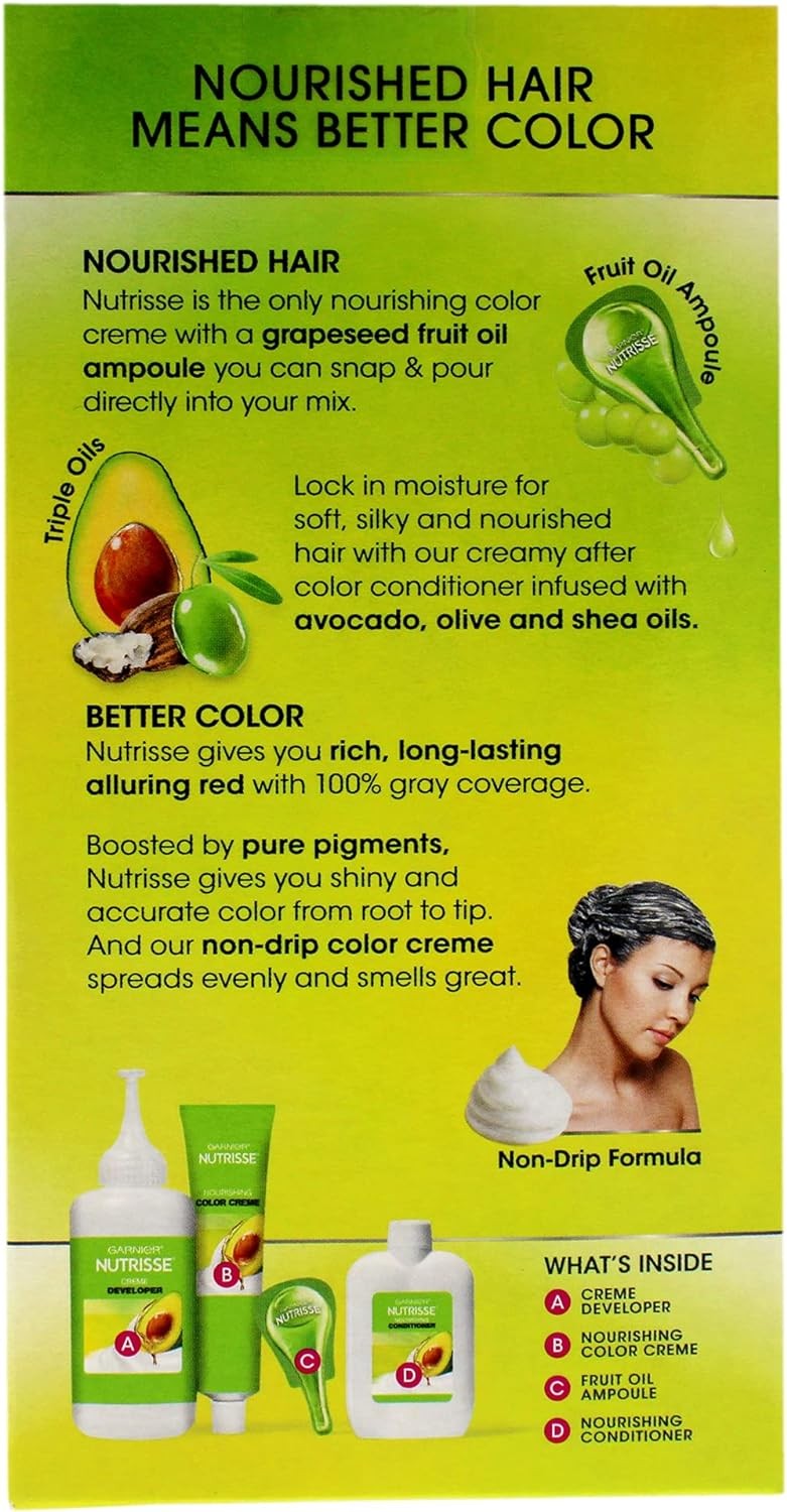 The non-drip formula spreads easily, smells great, and the after-color conditioner is infused with 3 fruit oils - avocado, olive and shea - for silkier, shinier, more nourished hair. Rich, Long Lasting Hair Color. Nourishing Triple Fruit Oils: Avocado, Olive, & Shea. Non-drip Formula. Garnier Nutrisse Level 3 Permanent Creme Haircolor True Red 66 (Pomegranate) Kit contains. Nutrisse Colorant. Fruit Oil Concentrate. Rinse-Out Conditioner. Nutrisse Developer