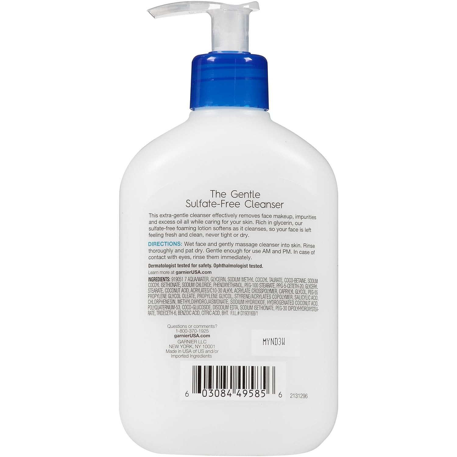 Garnier SkinActive The Gentle Sulfate-Free Cleanser, 13.5 Fluid Ounce. This extra-gentle cleanser effectively removes face makeup, impurities and excess oil all while caring for your skin. Rich in glycerin, our sulfate-free foaming lotion softens as it cleanses, so your face is left feeling fresh and clean, never tight or dry.